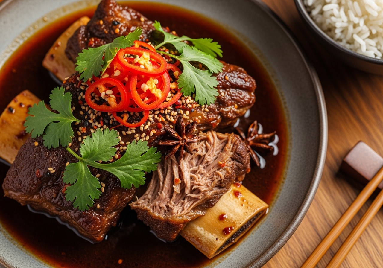 양념 농도가 꾸덕해지면 불을 끕니다. 마지막에 참기름 1스푼과 후춧가루를 더해 가볍게 버무려주면, 마늘의 알싸함과 참기름의 고소함이 조화를 이루는 명품 매운소갈비찜이 완성됩니다.